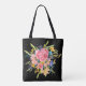 Uma rosa-rosa-esbranquiçada é a peça central deste spray floral colorido. Outras cores incluem amarelo, pêssego, lacrimejo, roxo, azul e laranja.