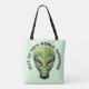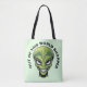 Faça suas viagens de compro para fora deste mundo com esta bolsa de tote divertida e peculiar. Apresentando uma design ousada de uma cabeça de alienígena verde sorrindo mal, dentes no cheio e a legenda lúdica "Fora deste World Shopper", esta bolsa é obrigatória para carregando de todos os seus tesouros terrestres e cósmicos.