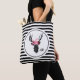 Um saco monograma personalizado com uma cabeça de cervo preto feita com linha geométrica e vestindo uma coroa floral rosa. Design russa e de tendências. Fundo é um padrão com faixa branca e preta.