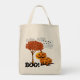 Bolsas de Truque de Halloween ou Tratar. Família de Abóbora Bonita de pé por uma árvore com Folhas de Outono Laranja em um Saco de Tota Esturdy. Lua branca e nuvens com uma família de Cabeça de Abóbora de Halloween, sorridente, com um grande Boo Amigo!