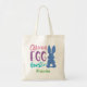 Caçador Oficial De Ovos Personalizado Para Crianças De Páscoa Tote Bag. Silhueta de coelho azul com cauda lisa. O texto diz Caçador Oficial de Ovos. Personalize com o nome na fonte verde. Excelente para a caçada de ovos na Páscoa, doces de Páscoa e doces. Bonito fonte colorida em rosa, roxo e verde.