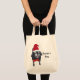 Este é um presente perfeito para amantes de cachorros. Esta bolsa de tote de canvas apresenta uma pintura de um cachorro preto e branco, vestindo um chapéu de Papai Noel vermelho e branco e uma fita vermelha, com um marcador para digitar em sua mensagem ou um nome.
