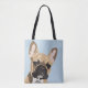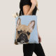 Saco de tote de buldogue francês de pop art, com um encanto vermelho giro em fundo azul pastel que pode ser mudado para qualquer cor.