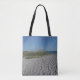 Um caiaque encalhado solitário em uma praia imprimiu all over em uma sacola impressa