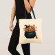 Caldeirão De Giggle & Gummies Tote Bag. Um boneco de caldeirão alegre, recheado de doces explodindo como confete, orgulhosamente esportando um chapéu de bruxa. Seu companheiro de vassoura se inclina perto, claramente à espera de um decolado carinhoso, o mais feliz movente de bruxas movido a açúcar do Halloween!