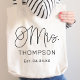 O roteiro de caligrafia preto moderno e casual "Sra.", que mostra a bolsa de tote de casamento feminina, apresenta texto personalizado com o novo sobrenome casado da noiva e a data/data do casamento estabelecida. Acessório perfeito para a lua de mel e além!