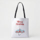 Um saco de tote com uma imagem digital de uma ilustração pintada de uma igreja vermelha e uma torre. Uma estrela de Natal brilhante brilhando. Famílias à frente chegando para uma igreja. A neve de inverno cobrir o chão e repousa em pinheiros fofos. Feliz Natal escrito em uma fonte vermelha.