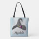 Este saco de tote personalizado é perfeito para mostrar o seu lado feiticeiro ou para recolher doces de Halloween. Ele apresenta uma ilustração do chapéu de bruxa decorado com lavandas e flores roxas e tem um ponto abaixo para adicionar um nome em letras negrito. O gráfico é colocado sobre um fundo azul claro pintado e um fundo lavanda.