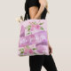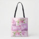 Saco de tota rosa-pincelado e bonito, com as palavras "Hello Gorgeous" num guião branco elegante, com um fundo de faixa de faixa púrpura lilás. Dois belos arranjos florais de primavera com rosas cor-de-rosa e verde completam o design. Esta bolsa de tote feminina e caprichosa faria um aniversário perfeito ou um presente de Natal!