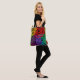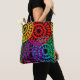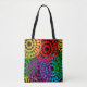 Este saco de totas tem um design de História Negra de grandes círculos formados a partir de formas de chuva e círculos em vermelho, amarelo, roxo, verde e turquesa.