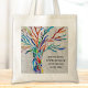 Este Saco de Tote exclusivo é decorado com um design de árvore de mosaico colorido. Adicione a citação escolhida para personalizá-la. Clique em Personalizar Mais para editar a fonte, o tamanho da fonte e a cor da fonte. Mosaico original © Michele Davies.