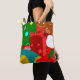 Esta bolsa de tote tem uma design de Natal de uma colagem de uma árvore de Natal, um ornamento, uma estocagem, um presente, e um rapaz de pão de gengibre.