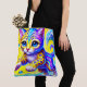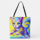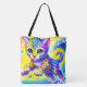 Esta bolsa de tote tem um gatinho colorido.