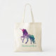 Uma silhueta colorida de um belo unicórnio em tons de aquarela de azul, verde, rosa e roxo. A bolsa de tot unicórn é personalizada com seu nome definido abaixo da imagem unicórn usando uma fonte moderna com seu nome definido em uma forma verde para adicionar um pop de cor ao seu nome. A imagem do unicórnio fica voltada para a esquerda em um lado e fica voltada para a direita no outro lado para que você possa desfrutar da imagem virada em qualquer direção.