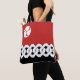 Este bolsa na moda, mas tradicional caracteriza um teste padrão chain japonês clássico em preto e branco e em um círculo do "mitsudomoe". Você pode mudar a cor vermelha no editor da personalização e usar a ferramenta do texto para adicionar sua nome ou mensagem!
