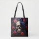 Um crânio humano é rodeado por rosas vermelhas, e visitado por um corvo nesta fabulosa bolsa de tote de Gótico. Escuro, assombroso e tão lindo!