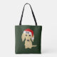 Esta sacola festiva de tote de férias mostra um desenho encantador de um Creme Dachshund Inglês vestindo um chapéu vermelho brilhante de Papai Noel. Personalizar com nome ou outro texto. Faz um presente de Natal divertido para mães de cão e pais doxos.