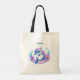 Um saco de tote com uma ilustração adorável. Um golfinho azul e roxo cercado por bonito plantas submarinas coloridas.