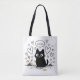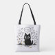 Adorable black cat sitting under a dreamy night sky surrounded by floating hearts and falling autumn leaves. The speech bubble says 'Love' in a soft, romantic style. This cute and moody illustration is perfect for cat lovers who enjoy dark academia and kawaii aesthetics. Beautiful All-Over print on both sides of the tote bag. Great as a daily bag, gift for her, or a cozy autumn accessory.
