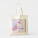 Esta bolsa de tote apresenta um design de unicórnio branco fofo com flores, estrelas e brilho dourado falso sobre fundo roxo. Personalize-o com um nome.