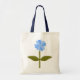 Esta brilhante bolsa de tote floral é uma ideia de presente de excelente. Ele apresenta uma imagem digital de uma margarida com um tronco verde com duas folhas verdes sobre ele e pétalas claras e azuis escuras. Esta é uma design simples, mas bonita.