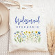 Esta bolsa simples e elegante apresenta uma borda de flores silvestres em tons de amarelo e azul com hastes verdes. A palavra "dama de honra" aparece em escrita manual azul. Personalize com o nome dela em fonte sans serif. Torna-se um presente perfeito para dama de honra!