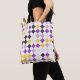Esta imagem apresenta um padrão geométrico repetido composto por formas de diamante coloridas dispostas em uma grade. Os diamantes se alternam entre cinzas amarelas brilhantes, roxas profundas, lavandas e escuras, separadas por espaços brancos, criando um arranjo vivo e equilibrado que lembra o árgula clássico e os azulejos de quebra-cabeça lúdicos. As cores são distribuídas uniformemente, fornecendo um impacto visual impressionante e moderno.