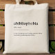 Muito bem, as palavras "Abibliofobia" podem ainda não ter sido aceites no dicionário, mas sentimos que é realidade de uma forma séria. Um saco de totes simples, moderno e minimalista num estilo de definição de dicionário com as palavras "Abibliofobia, substantivo falso: medo de ficar sem leitura. Muitas vezes, resolveu-se comprando mais livros."