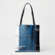 Este saco de totes apresenta um design geométrico elegante, moderno, com uma série de linhas de interseção e formas em tons de azul e branco profundos. Os padrões angulares criam uma sensação de profundidade e sofisticação, emprestando ao saco uma estética limpa e minimalista. As linhas brancas contrastantes adicionam estrutura, dando a impressão de superfícies dobradas e em camadas, quase reminiscentes de plantas arquitetônicas ou origami de abstrato. Esse bolsa versátil oferece estilo e funcionalidade, perfeito para as credenciais de carregando e fazer uma declaração de moda contemporânea.