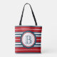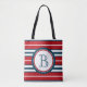 Design de temas náuticos com decoração em forma de monograma, em forma redonda, com ilustração em forma de corda sobre fundo listrado a azul, vermelho e branco