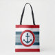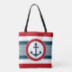 Design náutico com decoração em forma redonda com âncora sobre fundo listrado a azul, vermelho e branco