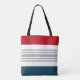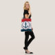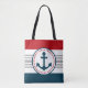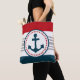 Design náutico com decoração em forma redonda com âncora sobre fundo azul, vermelho, cinza e branco listrado