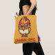 Um frango com aparência irritada, com a frase 'cacete' em um saco de tote