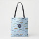 Este saco de tota monograma único com barco apresenta um padrão de embarcações marítimas de tamanho variado sobre um fundo azul claro - o padrão inclui 2 cargueiros, 2 veleiros, 2 cargueiros de madeira de estilo antigo, 1 barco de pesca, um barco a remo e uma embarcação - uma inspeção minuciosa do padrão revela pessoas desfrutando um dia no rio - "Um dia no rio" © katz_d_zynes 202020220 0