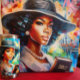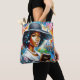A moça afro-americana está pronta para a missa de domingo de manhã. O trabalho de arte neste saco foi criado com tinta digital acrílica.