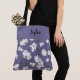 Saco elegante com orquídeas brancas e pretas delicadas em fundo roxo. A banda na parte superior do saco é personalizável adicionando seu nome (ou outro texto) em uma fonte de caligrafia preta.