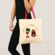 Um saco de tota de Natal bonito com um elfo festivo vestido com as tradicionais cores de Natal de vermelho e verde, ao lado de uma pilha de presentes de Natal, sob uma mensagem de Natal Feliz e ouro.