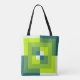 Esta imagem é um desenho abstrato geométrico com camadas quadradas concêntricas que espiralam para dentro. Os quadrados são feitos de cores ousadas e contrastantes: amarelo, laranja, vermelho, verde-oliva e roxo profundo. Cada quadrante alterna de cor, dando ao design um efeito dinâmico e quase óptico semelhante a ilusão. A combinação de tons quentes e legal cria um sentido de profundidade e equilíbrio.