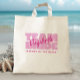 O design personalizado da bolsa de compras para o seu grupo de noivas apresenta "EQUIPE DE NOIVA" em negrito rosa claro. Personalize o nome da dama de honra em rosa escuro brilhante coordenado. "MÃE DA NOIVA" ou texto personalizado é apresentado abaixo. Todas as cores neste design são personalizáveis na área de ferramenta de design da Zazzle! O design se repete na parte de trás.