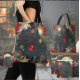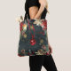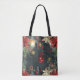 Um design de Natal de inverno que apresenta um fundo noturno de floresta verde-escura no inverno com flocos de neve de ouro, poinsetos, lanternas brilhantes, cones de pínus e bagos vermelhos com um ornamento de bola vermelha em uma fita vermelha que cai em um saco de impressão de tota durante o feriado.