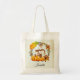 Um saco de tota de canvas personalizado com um esquilo giro parado atrás de algumas abóboras laranja-cor. Uma coroa foliar rodeia-os com uma folha de carvalho e flores laranja e outros ramos e folhas. O pano de fundo é um pergaminho vintage falso em uma cor creme, com um aspecto áspero.