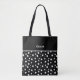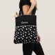 Saco de tote giro e giro com padrão de estrelas brancas sobre fundo preto e nome personalizado.