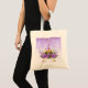 Um saco de tota de unicórnio roxo, lindo, com um rosto de unicórnio roxo, com uma peça de cabeça floral colorida, constituída por rosas roxos e outros arranjos florais roxos, corno roxo grande, coroa dourada e alças ouros. Ela está sob nuvem roxa e fofa com estrelas douradas nela. Esta bolsa de unicórnio faria uma bolsa de favor ou um saco de presente para uma festa de aniversário de unicórnio de uma menina.