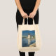Saco de compras Grindle Point Lighthouse. Esta bolsa de compras apresenta o Farol Grindle Point brilhando ao sol da manhã de um dia de primavera em Islesboro, Maine. A pintura usa uma paleta brilhante de azuis, verdes, cinzas e laranjas para criar uma vista bonita e calma da torre única do farol quadrado e da casa do faroleiro.