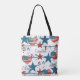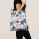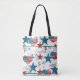 A bolsa de Tote apresenta estrelas patrióticas, corações e confete nas cores da bandeira americana com um retrato vintage. As palavras Liberdade, Fé e Liberdade estão espalhadas aleatoriamente na design.