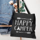 Sacos de tote com impressão personalizada com a citação tipográfica de "Camper Feliz" preto e branco. Design apresenta uma borda de seta tribal e um gráfico de árvore fofo. Use as ferramentas de design para escolher qualquer cor de fundo, adicionar seu próprio texto e fotos para criar um único design.
