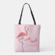 Esta design apresenta um saco de tota de Natal, com uma escrita simples, feliz e tipografia brilhante, e um flamingo cor-de-rosa com luzes de cordas, um design fofo, colorido, personalizado