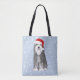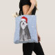 Esta bolsa festiva de tote de férias mostra um desenho encantador de um Bearded Collie vestindo um chapéu vermelho brilhante de Santa. Personalizar com nome ou outro texto. Faz um presente de Natal divertido para mães e pais de Beardie!