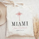 Dê as boas-vindas às amigas no fim de semana de despedida de solteira com essas adoráveis bolsas personalizadas. Perfeitas para locais praianos ou tropicais, este design apresenta uma ilustração da silhueta de uma palmeira cor-de-coral com o destino abaixo (mostrado com Miami) em letras serifadas clássicas. Adicione seu(s) nome(s) ou o nome da ocasião abaixo em letra cursiva manuscrita, bem como o ano.