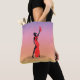 Dançarino Flamenco afligiu design em vermelho e preto. Ela está segurando um fã e parada em uma plataforma.